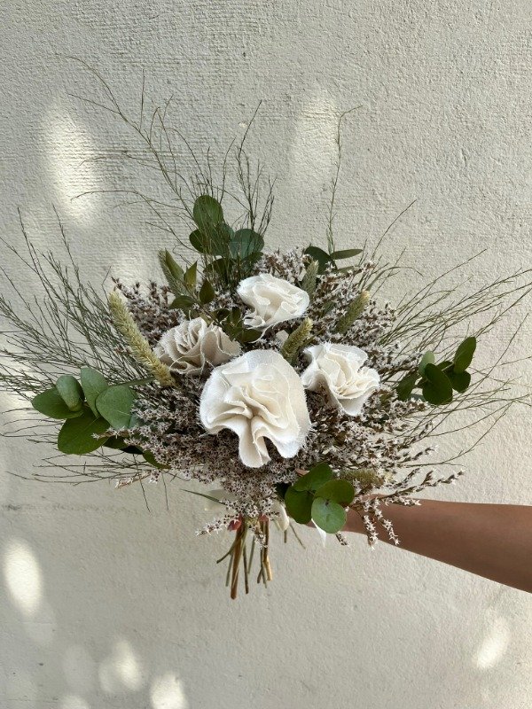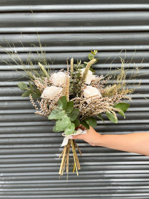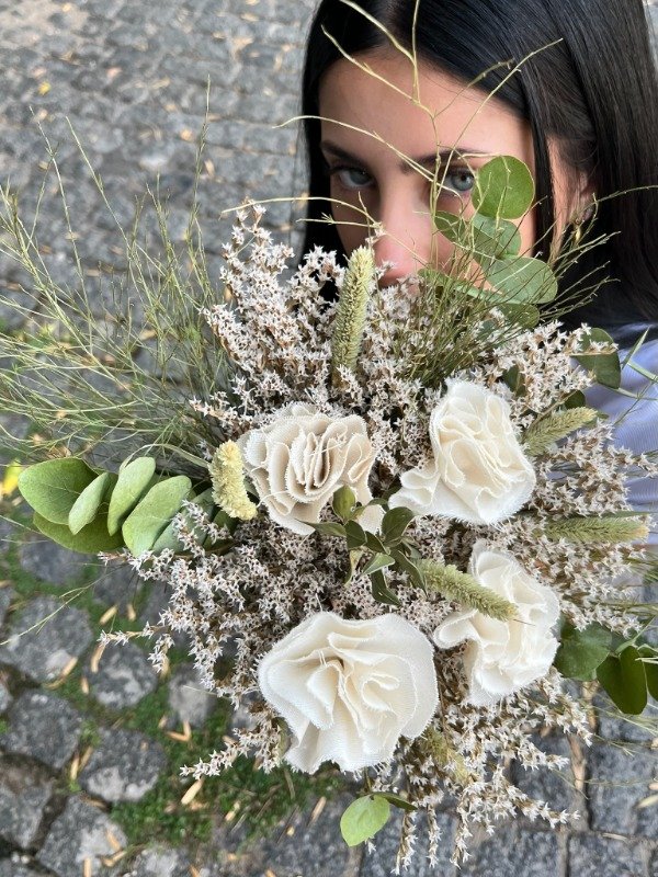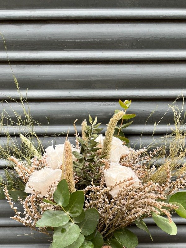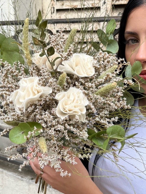 Composición: flores secas + flores de tela.